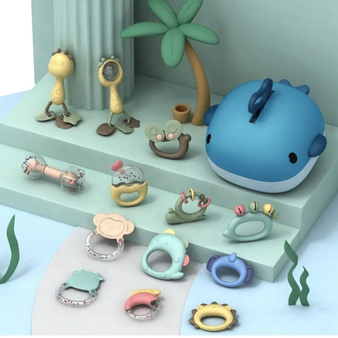 This colorful rattle and teether set is designed to engage infants at every stage of early development. With a variety of shapes, textures, and sounds, it helps stimulate sensory growth and support fine motor skill development.